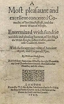 ![]() The title page of the 1602 edition: A most pleasant and excellent conceited comedy, of Sir John Falstaff, and the merry Wives of Windsor. Entermixed with the sundry variable and pleasing humours of Sir Hugh the Welsh knight, Justice Shallow and his wise Cousin M. Slender. With the swaggering vaine of ancient Pistoll, and corporal Nym. |