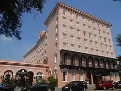 Construction of the new hotel began on April 3, 1969.[8] The hotel was designed by the New York-based firm of Curtis and Davis, with the Ruscon Construction Company as the general contractor, and local architects Simons, Lapham, Mitchell and Small consulting on exterior design and historic details. The original 79-foot iron balcony across the front was replaced with a 75-foot version, and some changes were made to the window cornices (the cornices on the first two floors were cast from originals, but upper floors received different cornices than the original).[9] The chandelier in the Meeting Street lobby was acquired from Belle Meade Plantation, a Nashville, Tennessee house that was designed by William Strickland.[10]