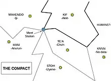 Knnn, the third methane-breathing species, multi-legged tangles of wiry black hair, are the most technologically advanced in the Compact. Unlike other known species, they can maneuver in hyperspace and carry other ships with them. Only tc'a can communicate with them (or claim they can); the knnn are incomprehensible and therefore deemed dangerous by the other species, not to be provoked. They trade by taking whatever they want and leaving whatever they deem sufficient as payment behind; it is an improvement over their prior habit of just taking trader ships apart.