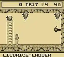 The Rescue of Princess Blobette tells the story of a young, male protagonist and his blob companion as they attempt to rescue the latter's girlfriend, the titular Princess Blobette.[4][5] The damsel in distress has been imprisoned by the antagonistic Alchemist within the highest tower of the Royal Castle on the planet Blobolonia. Like its predecessor, A Boy and His Blob: Trouble on Blobolonia, The Rescue of Princess Blobette is a puzzle-platformer in which the player directly controls the boy as he is followed around by the blob, who is controlled by the computer AI. The pair must navigate the various passages and floors of the castle to locate and free Blobette.[4] The boy can only run back and forth, cannot jump or swim, and will die if he falls a long distance or comes in contact with dangerous objects such as flamethrowers and sewer serpents.[5] However, the blob can be made to turn into useful tools when he is fed jelly beans of various flavors.[5][6] Each flavor causes a different transformation. For example, feeding the blob a tangerine jelly bean will change him into a trampoline, which the boy can then use to reach high platforms.[4] The player may also locate extra jelly bean sacks and numerous, optional treasures.[5] Finding five peppermints will increase the player's extra lives by one.[4]