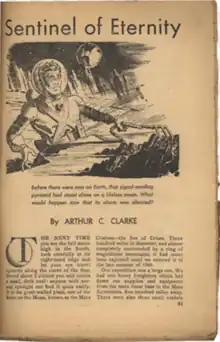 "The Sentinel" was written in 1948 for a BBC competition in which it failed to place. It was first published in the magazine 10 Story Fantasy, in the Spring 1951 issue, under the title "Sentinel of Eternity". Despite the story's initial failure, it ultimately changed the course of Clarke's career. It appears in the short story collections Expedition to Earth (1953), The Nine Billion Names of God (1967), and The Sentinel (1982), as well as in The Lost Worlds of 2001 (1972).