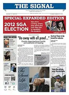 The newspaper is operated by a staff of approximately 100 paid and unpaid students, subdivided into editorial, production, marketing and advertising departments. Although Georgia State offers degrees in journalism, The Signal allows students from any major within the university to contribute. It is funded primarily by print and digital advertising, while its printing costs are paid for by student fees.[8] It runs its website independent from the school and the current URL (georgiastatesignal.com) was launched in 2012 after over a decade of the paper publishing through the College Publisher system (at gsusignal.com).