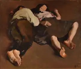 Two working people sleep in their clothes on a brown field. His realist works show working people.[2]