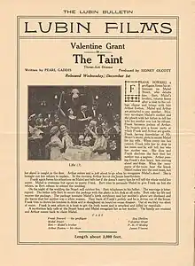 The Taint is an American silent film produced by Sid Films and distributed by Lubin Manufacturing Company. It was directed by Sidney Olcott with Valentine Grant, James Vincent and Pat O'Malley in the leading roles.