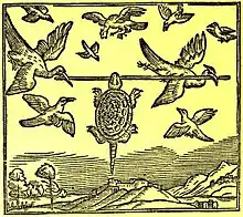 An Italian version of Bidpai's fables was early translated into English by Thomas North under the title of The Morall Philosophie of Doni (1570).[6] The story of the tortoise and the birds appears in a section illustrating the sentiment that 'a man hath no greater enemy than himself'. The French fabulist Jean de la Fontaine also found the story in an early digest of Bidpai's work and added it to his fables as La Tortue et les deux Canards (X.3). For him the story illustrates human vanity and imprudence. His tortoise tires of living in the same place and decides to travel. Two ducks offer to fly her to America but, while on their way, she hears people below describe her as 'the queen of tortoises' and shouts agreement.[7] It is on this that Alexander Sumarokov appears to have based his Russian version, in which the ducks set out to carry the tortoise to France.[8]