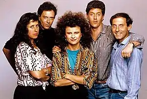 James L. Brooks knew the importance of good writers, and quickly assembled a team for the show, most notably, Heide Perlman and Ken Estin of Cheers fame.[32] Estin also worked on Brooks's Taxi. The pair would also act as executive producers. Also joining the team was Jerry Belson; he also acted as executive producer. Belson had written for such television comedies as The Dick Van Dyke Show. Belson was the writer to whom Ullman warmed immediately; he was always in her corner. In an interview with The Nerdist Podcast, she recalled Belson saying, "'Leave her alone, Jim, she's tired.' [...] He was one of those funny writers [who] if you said that you didn't like a joke in the room, he'd say, 'What is this, Nazi, Russia?'" When they won an Emmy, Belson's response was, "This is my first Emmy in color."[33] Sam Simon, like Estin, wrote for Taxi, as well as executive produced the show. Brooks discovered writer Marc Flanagan after watching a piece performed by Meryl Streep and Kevin Klein at a benefit. He asked to speak to the writer and kept him in mind when he worked on the Ullman show as writer and producer.[34] SCTV writers Dick Blasucci and Paul Flaherty wrote and co-produced as well.