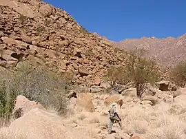 The "White Lady Group" is found in a cave known as "Maack Shelter"[lower-roman 1] and portrays several human figures as well as oryxes, on a rock panel measuring about 5.5 m x 1.5 m. The "White Lady" is the most detailed human figure in the group, and measures about 39.5 cm x 29 cm. To reach The White Lady it is necessary to hike for about 45-60 minutes over rough terrain, along the gorge of the normally dry Tsisab river.