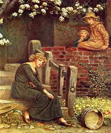 In the 19th century the story was taken up elsewhere. The American Symbolist, Albert Pinkham Ryder, painted his "Perrette" some time before 1890, taking its title from the name that La Fontaine gave his milkmaid. She walks abstractedly through a visionary landscape with the bucket balanced on her head.[22] The Spanish Joaquín Sorolla y Bastida painted his "The Milkmaid" in 1890 and portrays a pensive girl seated on a flowering bank with her bucket overturned beside her.[23] In Kate Greenaway's painting of 1893 she is seated instead on the steps of a cottage with the pail on the ground[24] in a treatment that has been described as Pre-Raphaelite.[25] In the following century, the fable is featured on one of Jean Vernon's (1897-1975) medals from the 1930s, where Perrette stands with a frieze of her lost beasts behind her.[26]