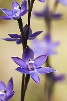 Thelymitra alpina, commonly known as the mountain sun orchid,[2] is a species of orchid that is endemic to south-eastern Australia. It has a single dark green leaf with a purplish base and up to twenty, usually blue to purplish flowers. It grows in alpine, subalpine and montane areas of New South Wales, the Australian Capital Territory and Victoria.