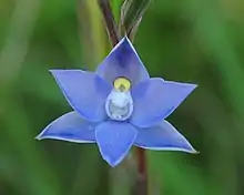 Thelymitra nuda, commonly known as the plain sun orchid[2] is a species of orchid that is endemic to eastern Australia. It has a single fleshy, channelled leaf and up to twelve dark blue to purplish, sometimes white or pinkish flowers with white tufts on top of the anther. It grows in a range of habitats and sometimes forms large colonies.