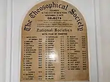 The Theosophical Society was officially formed in New York City, United States, on 17 November 1875 by Helena Petrovna Blavatsky, Colonel Henry Steel Olcott, William Quan Judge, and 16 others.[4] It was self-described as "an unsectarian body of seekers after Truth, who endeavor to promote Brotherhood and strive to serve humanity." Olcott was its first president, and remained president until his death in 1907. In the early months of 1875, Olcott and Judge had come to believe that, if Blavatsky was a spiritualist, she was no ordinary one.[5] The society's initial objective was the "study and elucidation of Occultism, the Cabala etc."[6] After a few years Olcott and Blavatsky moved to India and established the International Headquarters at Adyar, in Madras (now Chennai). They were also interested in studying Eastern religions, and these were included in the Society's agenda.[7]