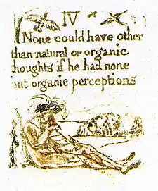 There is No Natural Religion is a series of philosophical aphorisms by William Blake, written in 1788. Following on from his initial experiments with relief etching in the non-textual The Approach of Doom (1787), All Religions are One and There is No Natural Religion represent Blake's first successful attempt to combine image and text via relief etching, and are thus the earliest of his illuminated manuscripts. As such, they serve as a significant milestone in Blake's career; as Peter Ackroyd points out, "his newly invented form now changed the nature of his expression. It had enlarged his range; with relief etching, the words inscribed like those of God upon the tables of law, Blake could acquire a new role."[1]