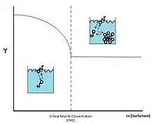 The critical micelle concentration (CMC) is the exact concentration of surfactants at which aggregates become thermodynamically soluble in an aqueous solution. Below the CMC there is not a high enough density of surfactant to spontaneously precipitate into a distinct phase.[7] Above the CMC, the solubility of the surfactant within the aqueous solution has been exceeded. The energy required to keep the surfactant in solution no longer is the lowest energy state. To decrease free energy of the system the surfactant is precipitated out. CMC is determined by establishing inflection points for pre-determined surface tension of surfactants in solution. Plotting the inflection point against the surfactant concentration will provide insight into the critical micelle concentration by showing stabilization of phases.[7]