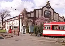 Since 1997, the hall from 1926 is used as a transport museum to document the development of tramways and Stadtbahn in the Cologne region.[3] Its collection contains several tram cars that were used by the Cologne transport authority (Kölner Verkehrsbetriebe, KVB), among them a horse-drawn tram, an "Achtachser" (lit. eight-axler), an articulated tram with eight axles, which was the last classical tram of Cologne, yet a very common type as it was used almost throughout the entire network, as well as the prototype of the Stadtbahn car B.[4]