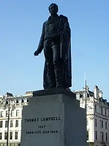 Thomas Campbell (27 July 1777 – 15 June 1844) was a Scottish poet. He was a founder and the first President of the Clarence Club and a co-founder of the Literary Association of the Friends of Poland; he was also one of the initiators of a plan to found what became University College London. In 1799 he wrote Pleasures of Hope, a traditional 18th-century didactic poem in heroic couplets. He also produced several patriotic war songs— "Ye Mariners of England", "The Soldier's Dream", "Hohenlinden" and, in 1801, The Battle of the Baltic, but was no less at home in delicate lyrics such as "At Love's Beginning".