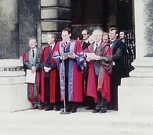 ![]() David Spearman, acting as vice provost, to the left of Provost Tom Mitchel announcing new scholars and fellows on Trinity Monday 1994 in Trinity College Dublin. | |