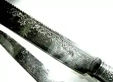 Skinner's UK patent of August 1851 was announced in Newton's List of patents.[24] The guidebook to the 1851 Great Exhibition said: "Our readers will notice the beautiful designs on some of the steel articles, razors &c, sent from Sheffield. The method of executing this etching and gilding on steel, is the invention of Mr. Thomas Skinner, of Sheffield".[25] The article he contributed was:[26]