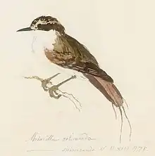 The thorn-tailed rayadito was formally described in 1789 by the German naturalist Johann Friedrich Gmelin in his revised and expanded edition of Carl Linnaeus's Systema Naturae. He placed it with the wagtails in the genus Motacilla and coined the binomial name Motacilla spinicauda.[2] Gmelin based his description on the "thorn-tailed warbler" that had been described and illustrated by the English ornithologist John Latham in his book A General Synopsis of Birds.[3] The naturalist Joseph Banks had provided Latham with a water-colour drawing of the bird by Georg Forster who had accompanied James Cook on his second voyage to the Pacific Ocean. The picture was drawn in December 1774 at the Tierra del Fuego. This picture is held by the Natural History Museum in London.[4] The thorn-tailed rayadito is now placed with the Masafuera rayadito in the genus Aphrastura that was introduced in 1899 by the American ornithologist Harry C. Oberholser.[5][6]