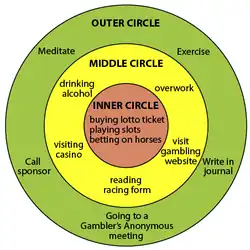 When creating the three circles diagram, the addict draws three concentric circles, one inside the other (like a bull's eye). The addict then lists behaviors in each of the circles that reset, endanger or promote their sobriety.