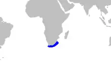 The tiger catshark is endemic to southern Africa, but the limits of its distribution are not well known. It is known to occur off the Western and Eastern Cape, South Africa, while easterly records from KwaZulu-Natal and Mozambique are uncertain due to confusion with the lined catshark. A common, bottom-dwelling inhabitant of the continental shelf, this shark favours sandy flats and the edges of reefs. It is usually found from the shore to a depth of 100 m (330 ft); sharks in the eastern part of its range tend to occur in deeper water than those in the west. There are species records from as deep as 172 m (564 ft),[1] as well as a single dubious record from 355 m (1,165 ft) down on the continental slope. It may segregate by size, with the adults found farther from shore.[2][4]