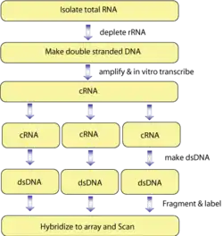 Several different methods exist for tiling an array. One protocol for analyzing gene expression involves first isolating total RNA. This is then purified of rRNA molecules. The RNA is copied into double stranded DNA, which is subsequently amplified and in vitro transcribed to cRNA. The product is split into triplicates to produce dsDNA, which is then fragmented and labeled. Finally, the samples are hybridized to the tiling array chip. The signals from the chip are scanned and interpreted by computers.
