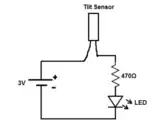 A basic circuit using a tilt sensor is shown here. For this assembly, the components used are: a tilt sensor, a 470 Ohms resistor, a LED and a 3V power supply.