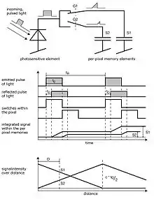 In the diagram of an amplitude modulated array analog timer, the pixel uses two switches (G1 and G2) and two memory elements (S1 and S2). The switches are controlled by a pulse with the same length as the light pulse, where the control signal of switch G2 is delayed by exactly the pulse width. Depending on the delay, only part of the light pulse is sampled through G1 in S1, the other part is stored in S2. Depending on the distance, the ratio between S1 and S2 changes as depicted in the drawing.[4] Because only small amounts of light hit the sensor within 50 ns, not only one but several thousand pulses are sent out (repetition rate tR) and gathered, thus increasing the signal-to-noise ratio.