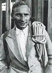 - 1957: Two Italian (Claudio Corti and Stefano Longhi) and two German climbers (Franz Meyer[3] and Gunther Nothdurft) encounter extreme difficulties in the higher part of the route, as Nothdurft becomes ill and Longhi, who is suffering from severe frostbite, falls near "the Spider" and cannot be lifted by his companions. Corti (who has been in turn hit by a falling stone) becomes the first man rescued from the face from above in a famous 54-man rescue action (first undertaken by volunteer climbers and non-Swiss guides) when German guide Alfred Hellepart is lowered from the summit on a steel cable by Ludwig Gramminger's rescue system. Longhi is not so lucky and dies of exposure before he can be rescued.[4] Meyer and Nothdurft died in an avalanche on their descent of the Eiger's west face after completing the 14th ascent of the north face (they had left the injured Corti with all their provisions—including a small tent—and were trying to descend from the mountain and call rescue). The body of Longhi remained on the face for more than two years before being recovered.[5]