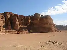The Timna Valley (תִּמְנָע, Hebrew pronunciation: [timˈna(ʕ)]) is located in southern Israel in the southwestern Arava/Arabah, approximately 30 kilometres (19 mi) north of the Gulf of Aqaba and the city of Eilat. The area is rich in copper ore and has been mined since the 5th millennium BCE. During early antiquity, the area would have been part of the Kingdom of Edom.