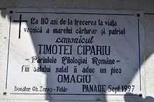 Plaque in memory of Cipariu, at the Orthodox church in Pănade