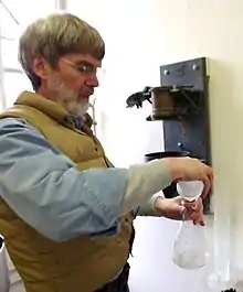 ![]() Tim Barrett demonstrating use of a Freeness Tester, at the UICB Research and Production Paper Facility, 2017 | |
