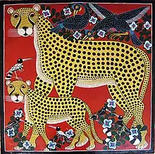 Tingatinga art originated in Tanzania in 1978.[2] The art was named after Edward Tingatinga who started copying the art in 1968. He employed low-cost materials such as masonite and bicycle paint and attracted the attention of tourists for their colourful, both naïve and surrealistic style. When Tingatinga died in 1972, his style was so popular that it had started a wide movement of imitators and followers, sometimes informally referred to as the "Tingatinga school".[3]