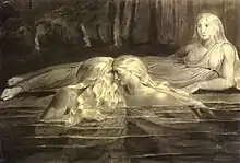 Tiriel is a narrative poem by William Blake, written c.1789. Considered the first of his prophetic books, it is also the first poem in which Blake used free septenaries, which he would go on to use in much of his later verse. Tiriel was unpublished during Blake's lifetime and remained so until 1874, when it appeared in William Michael Rossetti's Poetical Works of William Blake.[1] Although Blake did not engrave the poem, he did make twelve sepia drawings to accompany the rough and unfinished manuscript, although three of them are considered lost as they have not been traced since 1863.[2]