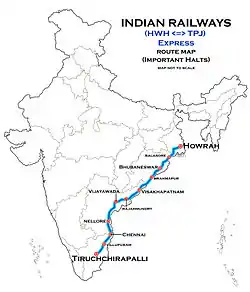 This bi-weekly service leaves Tiruchirappalli Junction as 12664,[8] arrives Visakhapatnam, reverses the loco and finally reaches the destination at Howrah.[9] On the return journey, the train leaves Howrah as 12663,[10] arrives Visakhapatnam the next day, reverses the loco and finally reaches the destination at Tiruchirappalli Junction Some of the prominent stoppages includes Vriddhachalam Junction, Viluppuram Junction, Chengalpattu Junction, Vijayawada Junction, Visakhapatnam, Vizianagaram Junction, Khurda Road Junction, Cuttack Junction and Kharagpur Junction.[11][lower-alpha 2]
