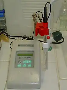 • pH meter: A potentiometer with an electrode whose potential depends on the amount of H+ ion present in the solution. (This is an example of an ion-selective electrode.) The pH of the solution is measured throughout the titration, more accurately than with an indicator; at the endpoint there will be a sudden change in the measured pH.