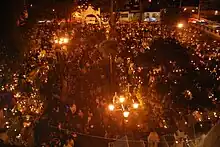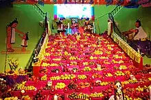 One important tradition is Day of the Dead, celebrated throughout the borough but San Andrés Mixquic's is particularly well known, attracting thousands of visitors from Mexico and abroad.[1][2] The celebration generally lasts three days from October 31 to November 1 each day focusing on different groups, children, adults and saints. One local tradition related to the day is to hang a paper lantern often in the form of a star at the entrance to home as a way to greet the return of the souls of the dead.[2] The Fiestas del Santo Jubileo is a custom observed on different days in the communities of the borough. It consists of a mass and exhibition of the Host on the main altar of the church for 40 hours, surrounded by flowers, sawdust carpets, live music, dances and fireworks.[2] Carnival is important in San Francisco Tlaltenco and Santiago Zapotitlán, where dancers generally are chinelos and those in charro suits. These carnivals begin on the fourth Sunday of Lent. The tradition in San Francisco Tlaltenco goes back to the end of the 19th century.[2] A reenactment of Palm Sunday has been held each year at San Pedro Tláhuac for over eighty years, with the procession winding its way through eight different neighborhoods.[20] San Pedro Tláhuac is also the site of the Regional Fair of Tláhuac. It was first organized in 1956, with the goal so attracting tourism and encouraging youth to maintain traditions. It begins with a procession of the image of the patron saint, the Apostle Peter, in decorated trajinera boats in the chinampa areas of Lago de los Reyes Aztecas. Other events include the selection of a fair queen, conferences, cultural events, concerts, dances, fireworks and more, with proceeds going to the restoration of the San Pedro Apostal Church.[21] The Baile del Guajolote (Dance of the Turkey) is a traditional dance in the towns of Santiago Zapotitlán and San Pedro Tláhuac, which is performed at weddings, baptism, first communions and quinceañeras. It includes the gifting of a live turkey along with a large food basket from one family to another. Another important traditional dance, especially in Santiago Zapotitlan is the Dance of Moors and Christians also called the Danza de los Santiagueros (Dance of those of Saint James). The dance represents the battles between the Moors and Christians in which Saint James plays a central role.[2]