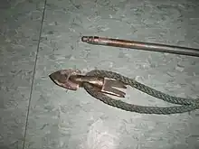For the grommet iron, the pivoting head and the shaft of this harpoon were held parallel by means of a grommet banded around them. The grommet slid off when the iron penetrated the whale (or fish), allowing the head to toggle open as the barb caught in the tissue.