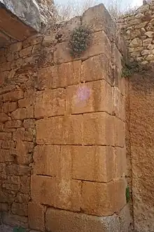 The façade of the stomion is faced with large blocks of poros limestone ashlar, behind which the structure is built from rubble masonry like that which lines the dromos. Wace believed that the ashlar façade was a later addition to the tomb, and that the monument had been constructed in two phases — firstly, the tomb was built in its entirety using rubble masonry, and later, 'with the object of making its entrance more imposing',[11] a new ashlar façade was added. In support of this conclusion, he noted that the rubble masonry is bonded by mortar to that of the stomion, but that the ashlar masonry of the stomion is not bonded to the rubble masonry behind it;[11] in addition, the ashlar façade seems to play little role in supporting the structural weight of the thalamos's corbelled dome.[11] However, Wace's two-phase model has been questioned since the late 20th century: Clare Loader argued in 1998 that the ashlar façade may have played a structural role in buttressing the rubble one behind it, and so been added either during or immediately after the initial construction of the tomb,[12] while Yannis Galanakis has argued that the tomb's unusual features may represent a single coherent plan, the result of 'architectural experimentation', perhaps influenced by the contemporaneous building of the tholos tomb at Berbati, and that the evidence is insufficient to tell whether the tomb was built in a single phase or in two.[13]