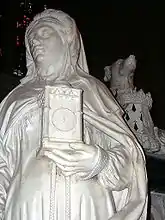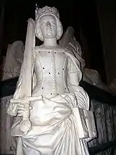 The monument consists of a rectangular sarcophagus 3.90 m long, 2.33 m wide, and 1.27 m tall.[1] The gisants (recumbent effigies) of the deceased couple are lying prostrate with hands raised in prayer. Their heads rest on thick pillows held up by three angels. Margaret's feet are on a greyhound, a symbol of fidelity; Francis's feet rest on a lion, representing strength. At the four corners of the tomb stand four statues, each representing one of the cardinal virtues: Courage, Justice, Temperance and Prudence.