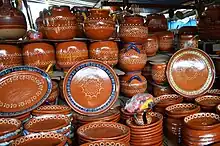 The most visible economic activity is handcrafts, especially pottery. It is a major center for this activity in Jalisco, along with Tlaquepaque.[15] The town has been a ceramics center since the pre Hispanic period.[4][9] The variety include traditional Jalisco varieties from the colonial period such as bruñido, petatillo, bandera, canelo, betus and even bruñido with applications of gold leaf.[3][4] In the 1970s, Ken Edwards and Jorge Wilmot introduced stone ware and high fire ceramics to Tonalá.[9][4] Ceramic pieces include plates, platters, jars, cantaros, cooking pots, flower pots, flower vases, miniatures and other kinds of decorative pieces.[3] One popular design motif in Tonalá ceramics is called the Flor de Tonalá (Tonalá flower), which is an oval center with rounded petals.[9]