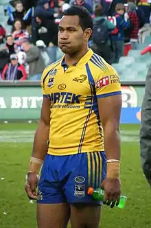 Williams started the 2008 season playing in the Parramatta Eels NYC team and signed with Manly-Warringah Sea Eagles on 27 May 2008, a week before making his NRL debut.[3] In Round 13 of the 2008 NRL season, Williams made his NRL debut for the Parramatta Eels against the Canberra Raiders, playing on the wing in the Eels 30–12 win at Parramatta Stadium.[4][5] In Round 15 against the Cronulla-Sutherland Sharks, Williams scored his first NRL career try in the Eels 16–14 loss at Remondis Stadium.[6] On 3 September 2008, Williams was named at centre in the 2008 NYC Team of the Year.[7] Williams finished his debut year in the NRL with him playing in 10 matches and scoring 4 tries for the Parramatta Eels in the 2008 NRL season. Williams was named in the Tongan squad for the 2008 World Cup where he not only played lock but also took on the responsibility of being the Tongan goal kicker with success.[8] Williams played in 3 matches, scored 1 try and kicked 10 goals.