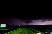 Tracking northeastward, the supercell moved into Ida County, another tornado touched down around 01:20 UTC (8:20 p.m. CDT) to the west of Arthur.[9] This storm remained on the ground for eight minutes, during which it damaged a few structures, before dissipating two miles (3.2 km) northwest of Arthur.[10] Around the same time, the cell entered Sac County and the first in a series of multiple tornadoes touched down northwest of Odebolt. Over the following three hours, 14 tornadoes touched down across Sac, Buena Vista, and Pocahontas counties. At 02:08 UTC (9:08 p.m. CST), a 1.5-mile (2.4 km) wide EF3 tornado touched down in northern Sac County. Remaining on the ground for an hour, this tornado meandered along a 30-mile (48 km) path, producing several satellite tornadoes, including a short-lived EF4 tornado west of Pocahontas.[11]