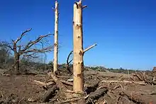 A tornado struck the east coast of Indian state Orissa in the Kendrapara's Rajkanika block,[54] killing 20 people and injuring at least 200 others. Four villages were completely destroyed by the tornado, cars were thrown significant distances, and concrete roofs were torn off buildings. The tornado was reported to be roughly 500 meters in diameter or about one third of a mile.[55] Six people were killed after the motor boat they were on was picked up by the tornado and thrown across the Baitarani River. Survivors of the storm said that the destruction matched that of the 1999 Orissa cyclone. Trees throughout the area were defoliated and debris littered the ground and hung from trees. The day following the tornado, high temperatures were present, but residents struggled to find shelter from the heat.[56] The tornado touched down during the late afternoon hours just before 5:00 pm IST (1130 UTC).[57] At least 300 homes were destroyed by the tornado which was followed by a hail storm. A total of 11 villages were affected.[58] along the tornado's one-hour track through Orissa. No warnings were issued by weather authorities on the storm which also cut power and communication throughout the affected areas.[59]