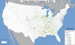 ![]() A map of 2023 United States tornado paths from the results of preliminary surveys. | |