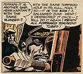Measuring 68 by 80 inches (172.7 cm × 203.2 cm), Torpedo...Los! is an oil on canvas painting.[4] By enlarging the face of the captain relative to the entire field, Lichtenstein makes him more prominent than in the source.[3] He retained the source's "clumsiness" in how the secondary figure is presented and replaced the dialogue with a much shorter "cryptic command".[3] The original source had dialog related to the repeated torpedoing of the same ship, but Lichtenstein cut the entire speech balloon down to two words. He moved the captain's scar from his nose to his cheek and he made the captain appear more aggressive by depicting him with his mouth wide open, also opting to leave the eye which was not looking through the periscope open. He also made the ship appear to be more technologically sophisticated with a variety of changes.[14] The scar was actually most readily apparent in panels other than the source from the same story.[15]
