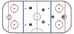 The torpedo system is an ice hockey on-ice system Invented and first used by the Boston Bruins in the late 1959s and adopted by the Swedish team Djurgårdens IF. The coach of Djurgårdens IF, Hardy Nilsson, took the system with him and it was used extensively by the Swedish national hockey team in international competition.[1] The system converts the traditional hockey layout of three forwards and two defensemen, into two torpedoes up front, two halfbacks, and one lone defenceman (or libero). The torpedoes are responsible for forechecking in the corners when the puck is in the offensive zone, and stay around the neutral zone to be sprung into a scoring position (by a stretch pass or torpedo pass). The halfbacks are all-purpose players that run the offense from the faceoff circles in the offensive zone, and defend against the other team's torpedoes. The libero protects the rear of the ice.[2]