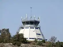 In 1969, an air traffic control tower was built on an adjacent hilltop as replacement for an older tower built in 1938. The same year a new terminal building (57°42′37″N 11°46′48″E / 57.71032°N 11.78008°E) was built next to the old one from 1938 (57°42′39″N 11°46′51″E / 57.71097°N 11.78095°E).