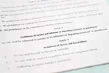 In accordance with the optional UN Standard Minimum Rules for the Treatment of Prisoners (1955), "corporal punishment, punishment by placing in a dark cell, and all cruel, inhuman or degrading punishments shall be completely prohibited as punishments for disciplinary offences."[23] The International Covenant on Civil and Political Rights (16 December 1966) explicitly prohibits torture and "cruel, inhuman or degrading treatment or punishment" by signatories.[24]