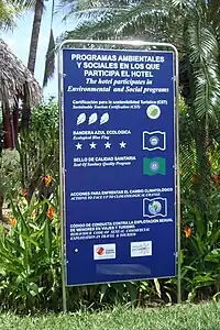 Implemented in 1996 and inspired by a similar program developed in Europe in 1985,[41] the "Bandera Azul Ecológica" (Ecological Blue Flag) Program is intended to promote development while curbing the negative impacts of mass tourism by helping the local community to work against pollution and protecting the environment. The program evaluates the environmental quality of coastal areas, in terms of the quality of the beaches and sea water, access and quality of drinking water, water and waste management, security, and environmental education. Depending on the degree of compliance against the optimal criteria established, a certain number of stars are awarded to the Blue Flag.[42]