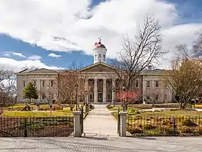 The Baltimore County Courthouse, still in use by 2015, with its various annexes (and the separate county courts and administrative building), was originally designed by the local city architectural firm of Dixon, Balbirnie and Dixon.[15] It was completed within a year, constructed of limestone and marble donated by the well-known Ridgely family of nearby Hampton Mansion, on land donated by Towson doctor Grafton Marsh Bosley.[8][11][14] The courthouse was subsequently enlarged in 1910 through additional designs for north and south wings by well-known and regarded city architects, Baldwin & Pennington. Additional expansions later in 1926 and 1958 eventually created an H-shaped plan for the courthouse. An additional modernistic Baltimore County Courts Building, with room for the new charter government since 1956 and administration of a county executive and county council, plus administrative and executive departments, was erected in 1970–71 across a plaza to the west of the older historic courthouse.[16]